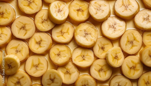 Macro shot of perfectly arranged banana slices, creating a seamless golden pattern with smooth texture, highlighting the natural curves and vibrant color of the fruit.