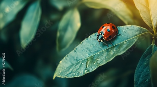 Macro shots, Beautiful nature scene. Beautiful ladybug on leaf defocused background