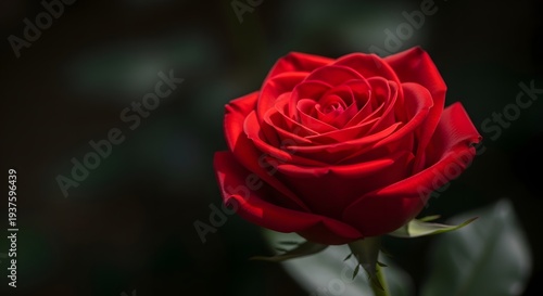 Macro view of beautiful red rose blooming with soft lighting against dark blurred background