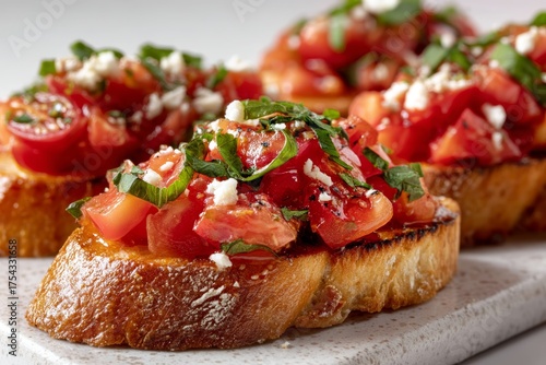 Macro view photography of a delicious bruschetta on a ceramic tile on white background