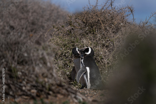 Magellanic penguin on beach on Valdés peninsula. Penguins colony in Argentina. Black and white birds on the beach.