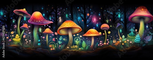 Magic mushroom pattern in fairy tale woods, nature wallpaper, panorama. Generative Ai.