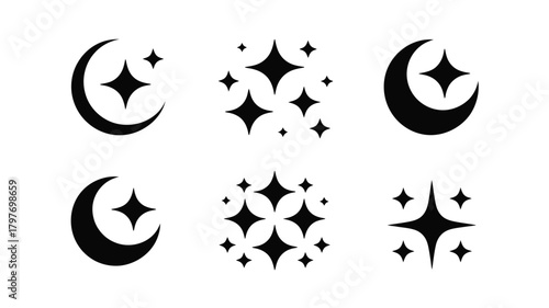 Magical Black and White Night Sky Elements for Branding and Design Projects Featuring Moons and Stars, Perfect for Adding a Touch of Celestial Wonder