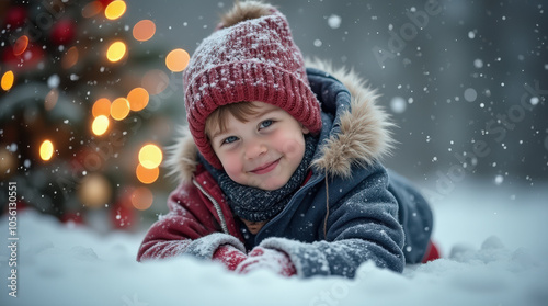 Magical Christmas Moments: Child Enjoying Snow Play with Festive Lights and Winter Wonderland Scene