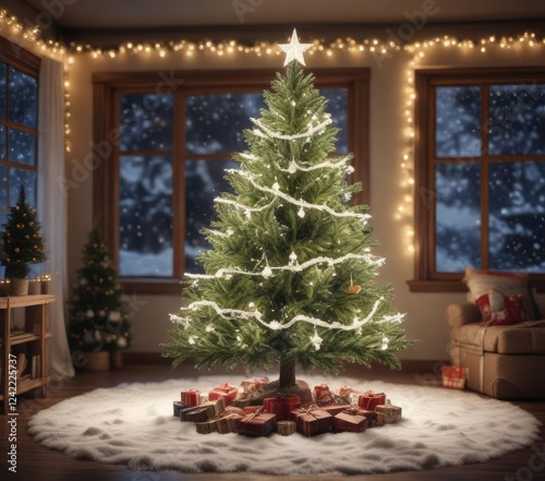 Magical Christmas tree decorated with snow and twinkling lights, cold, decorations, festive, Christmas tree, nature