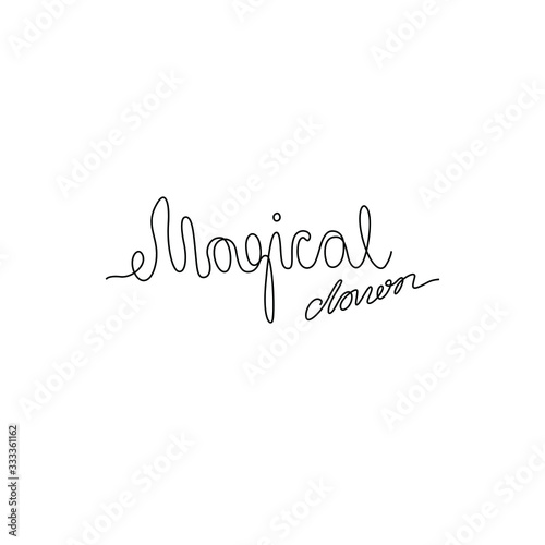 Magical dawn inscription, continuous line drawing, hand lettering, print for clothes, t-shirt, emblem or logo design, one single line on a white background. Isolated vector illustration.