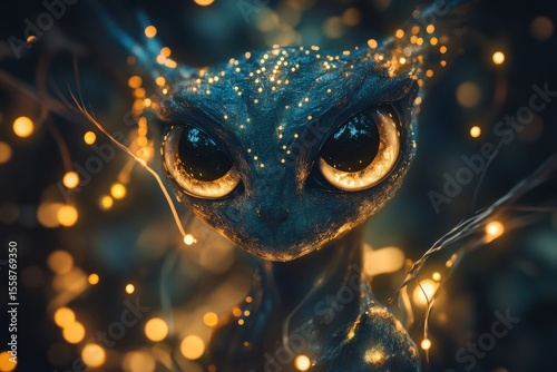 Magical fantasy creature with large eyes surrounded by stars and sparkles.