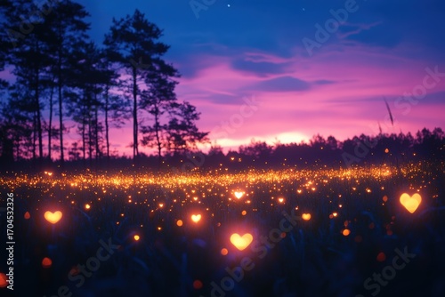 Magical Field of Glowing Heart Lights at Sunset, Perfect for Romance and Love Themes