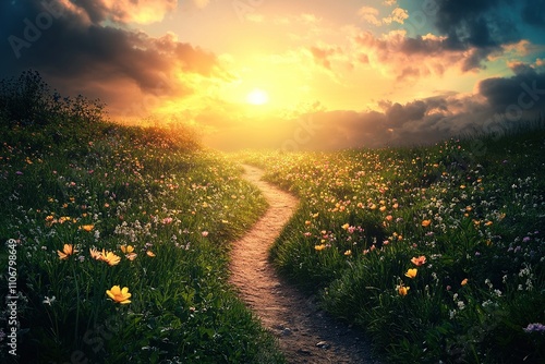 Magical flower field under vibrant sunset