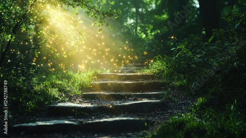 forest, path, step, stone, green, leaf, light, sunlight, magical, fantasy, mystical, sparkle, glistering, nature, tree, wood, pathway, paseo, staircase, scenic, landscape, environment, summer, spring, dawn, morning, gold, yellow, bright, dark, shadow, mystery, enchantment, dreamlike, serene, peaceful, tranquil, calm, beautiful, vibrant, lush, foliage, texture, depth, atmosphere, mood, feeling, emotion
