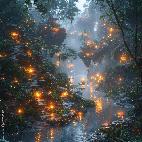 Magical forest river with glowing lights at dusk.