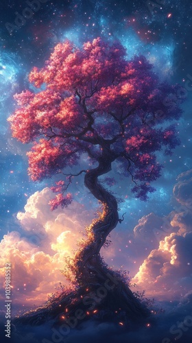 Magical glowing tree surrounded by floating lights in a peaceful setting, AI generated