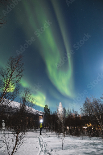 Magical green stripe of the Aurora Borealis with full moon above mountain covered in snow in the Troms region of Northern Norway