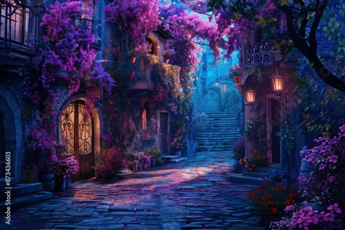 enchanted, twilight, alley, cobbled, purple, flower, glowing, lantern, dusk, magical, street, fantasy, wisteria, night, charming, mystical, fairy, tale, lantern, light, blooming, romantic, whimsical, peaceful, architecture, stone, pathway, evening, illuminated, earth