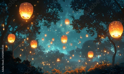 lantern, night, sky, light, tree, forest, glowing, celebration, event, magical, floating, aethereal, illuminated, serene, dreamy, dusk, nature, landscape, dark, mystic, peaceful, tranquil, fantasy, ambience, decoration, sparkle, warm, evening, twilight, paper, scene, outdoors, park, wood, festive, glow, shadow, silhouette, star