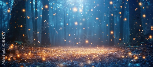 Magical night forest scene with blue hues and sparkling golden lights suspended in air, creating an enchanting atmosphere of wonder and charm.