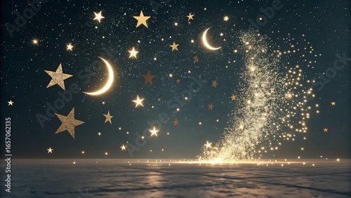 night sky, star, moon, crescent moon, sparkling, glowing, magic, fantasy, celestial, astronomy, universe, galaxy, cosmos, dreamy, aethereal, enchanting, wonder, night time, dark, blue, gold, light, illumination, water, surface, abstract, background, celebration, festive, holiday, new year, christmas, birthday, anniversary, romance, peaceful, serene, calm, beautiful, shimmering, glistering, aurora, nebula, space