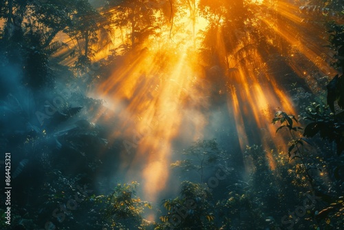 forest, jungle, sunbeam, sunlight, mist, fog, beam of light, mystical, nature, tree, leaf, foliage, dense forest, aethereal, serene, calm, peaceful, tropical, wilderness, natural light, adventure, exploration, rainforest, atmospheric, scenic, enchanting, beautiful, breathtaking, light rays, morning light, timberland, flora, lush, green, sunrise, dense, canopy, natural beauty, vibrant, scenic view, tranquil, verdant, environment, photo, untouched