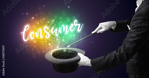Magician hand conjure with wand and Consumer inscription, shopping concept