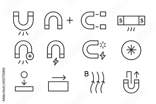 Magnet icon set: symbols of magnetism, poles, and magnetic field concepts