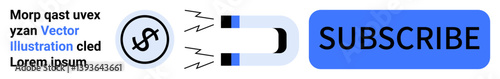 Magnet pulling dollar symbol with subscribe button nearby, symbolizing marketing, lead generation. Ideal for digital marketing, business, growth, subscription models, finance, customer retention