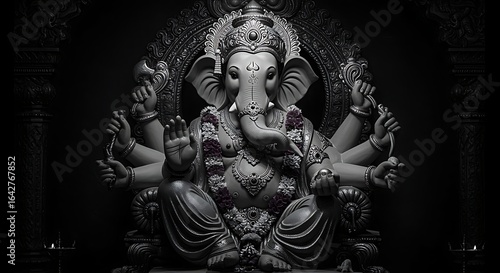 ganesh, idol, sculpture, black-and-white, monochrome, deity, religion, hinduism, spirituality, wisdom, prosperity, indian culture, traditional, ornate, throne, art, artistic, culture