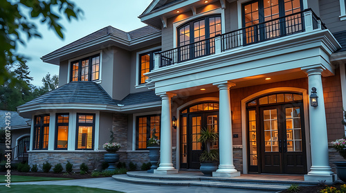 house, home, architecture, building, exterior, luxury, property, residence, modern, design, night, evening, window, door, column, balcony, stone, brick, lighting, grand, elegant, residential, facades, roof