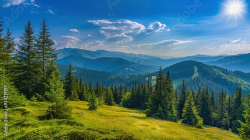 Magnificent panoramic view the coniferous forest on the mighty Carpathians Mountains and beautiful blue sky background. Beauty of wild virgin Ukrainian nature. Peacefulness , ai