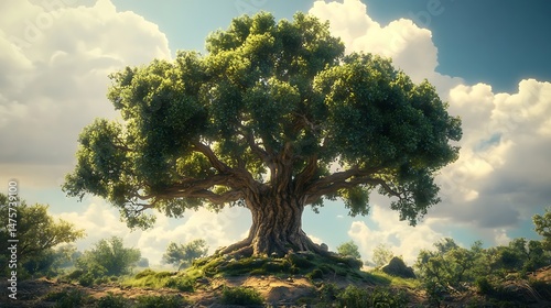 tree, nature, landscape, environment, sky, cloud, foliage, green, trunk, tree branch, sunlight, outdoors, scenic, growth, ecology, forest, timberland, beauty, peace, serenity, earth, horizon, daylight, natural, flora, leaf, big, ancient, isolated, background, copy space, template, illustration, digital, design, artwork, texture, organic, botany, conservation, wildlife, ecosystem, rural, countryside