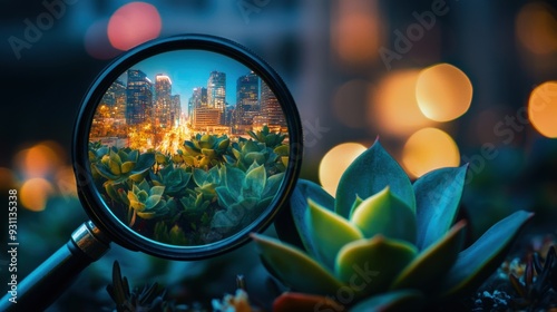 Magnified urban night view of city skyline through glass lens and succulents