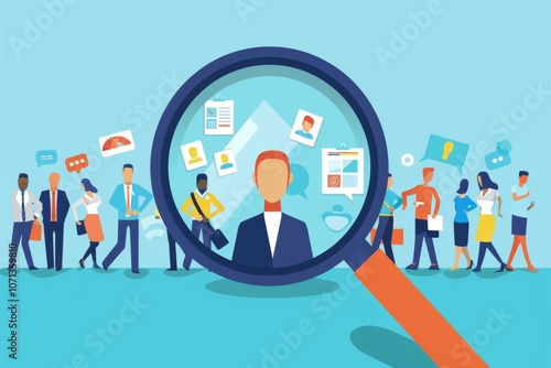 Magnifying glass centered on a manager icon amidst staff, illustrating HR processes like interviews and targeting