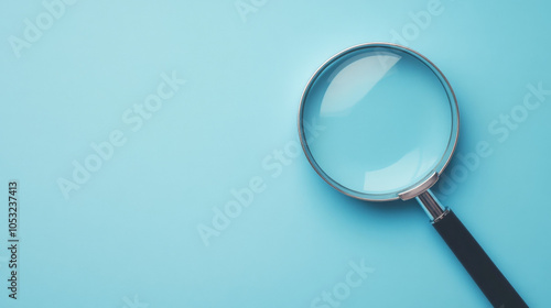 Magnifying Glass on Blue Background: A detailed close-up shot of a magnifying glass against a pastel blue backdrop. Perfect for concepts related to investigation, research, or discovery.
