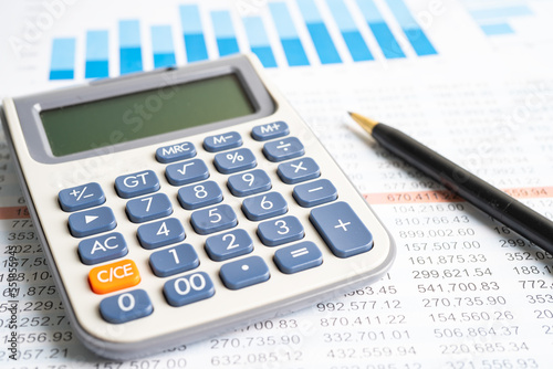 Magnifying glass on charts graphs spreadsheet paper with calculator. Financial development, Banking Account, Statistics, Investment Analytic research data economy.