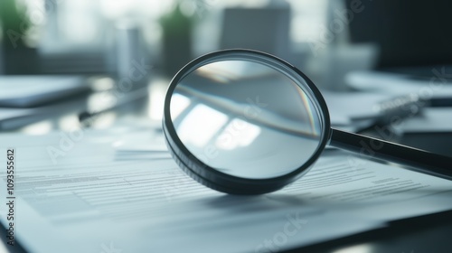 Magnifying glass on documents highlighting details in an office workspace during daylight hours