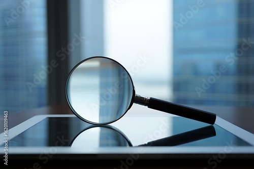 magnifying glass, tablet, screen, city landscape, blurred, digital, investigation, exam, online, information, search, discovery, analysis, technology, datum, research, sharpened, detail, closeup, modern, business, insight, clarity, surveillance, inspecting, verification, inspection, review, exploration, contraption, device, communication, connectivity, network, cyber, security, intelligence, forensic, legal, financial, strategy, planning, overview, perspective, visual, concept, idea, symbolism