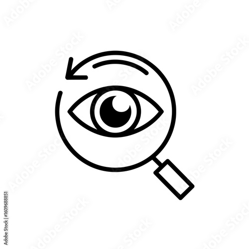magnifying glass, eye, vision, exam, opthalmology, health care, medicals, analysis, research, diagnosis, monitoring, technology, optometry, inspection, science, symbol, icon, signs, graphic, clip art, illustration, vector, black-and-white, health, wellness, diagnostic, detection, arrow, circle, lens, sharpened