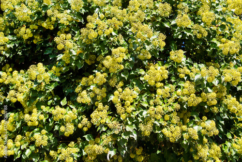 Mahonia holly Apollo (Latin Mahnia aquifolium) bright green on a clear sunny day. Flora is the nature of a plant.