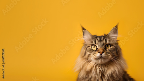 Main coon cat post on yellow background with copyspace (Generative AI)