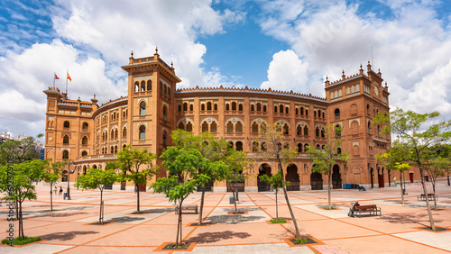 Main facade of the Las Ventas bullring with its old brick architecture, Madrid.