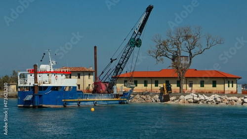 tour tourism, travel, summer, sunny, holiday, vacation, boat, motorboat, ship, vessel, technical equipment, shoveling, stone, maintenance, sea, ocean, bay, cove, water, shore, coast, coastline, island, grado, italy, europa