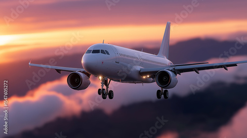 Majestic airplane flying through vibrant sunset clouds with golden light reflections,sunset sky, airplane in flight, commercial jet, evening clouds, global travel, golden hour aviation, sky journey,