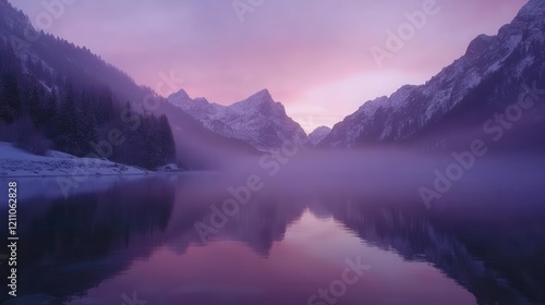 majestic alpine lake at dawn, snow-capped peaks reflected in crystal-clear water, pink and purple sky, morning mist rising