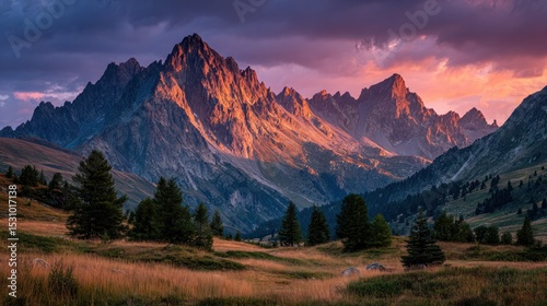 Majestic alpine mountains bathed in warm orange and purple sunset light