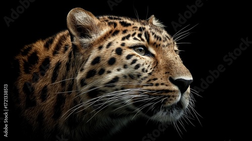 Majestic amur leopard portrait with intense gaze isolated on black background, wildlife photography of rare big cat in natural detail