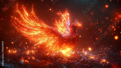 Majestic and powerful mythical phoenix bird rising from glowing embers with radiant fiery wings spread out in a dynamic graceful motion This digital captures the energy
