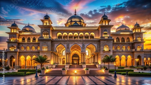 Majestic Architectural Masterpiece at Dusk: A Blend of Tradition and Modernity with Stunning Arches and Illuminated Facades