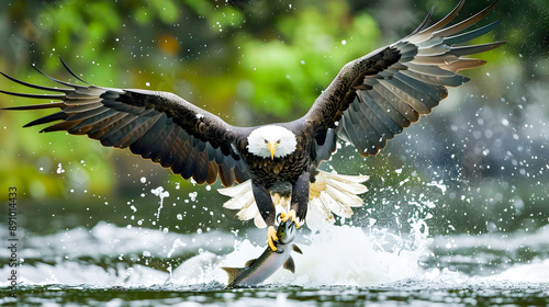 Majestic Bald Eagle Catching Salmon Fish with Spread Wings in River Powerful predatory bird hunting its prey with grace and momentum creating a dramatic aquatic scene