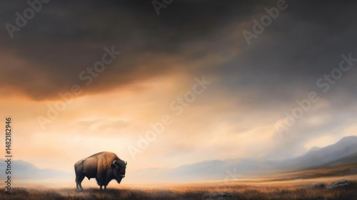 Majestic Bison Standing Alone in a Vast Prairie Landscape at Dusk