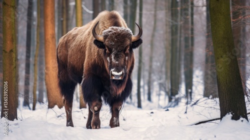 Majestic Bison Standing in a Snowy Forest Landscape background