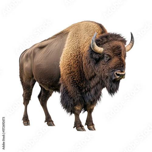majestic bison standing isolated on transparency background, showcasing its thick fur, curved horns, and powerful build, symbolizing strength and resilience